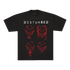 Disturbed logo with faces graphics on front, tour dates and cities on back printed on a black tee.